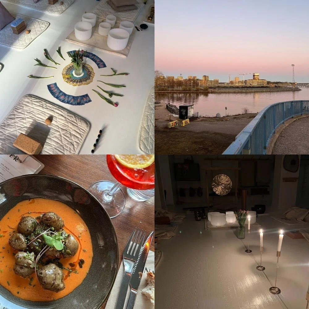 What to expect? The stunning Sagayoga studio in Kallio will welcome you with a ready set-up for your journey to awaken the 5 senses. High quality yoga props & a beautiful space for movement and the sound bath. Ravintola Tanner next door will host us for a 3-course dining experience. Two private saunas with sea view, indoor showers, and avanto are waiting for us at Sörnaistenranta.